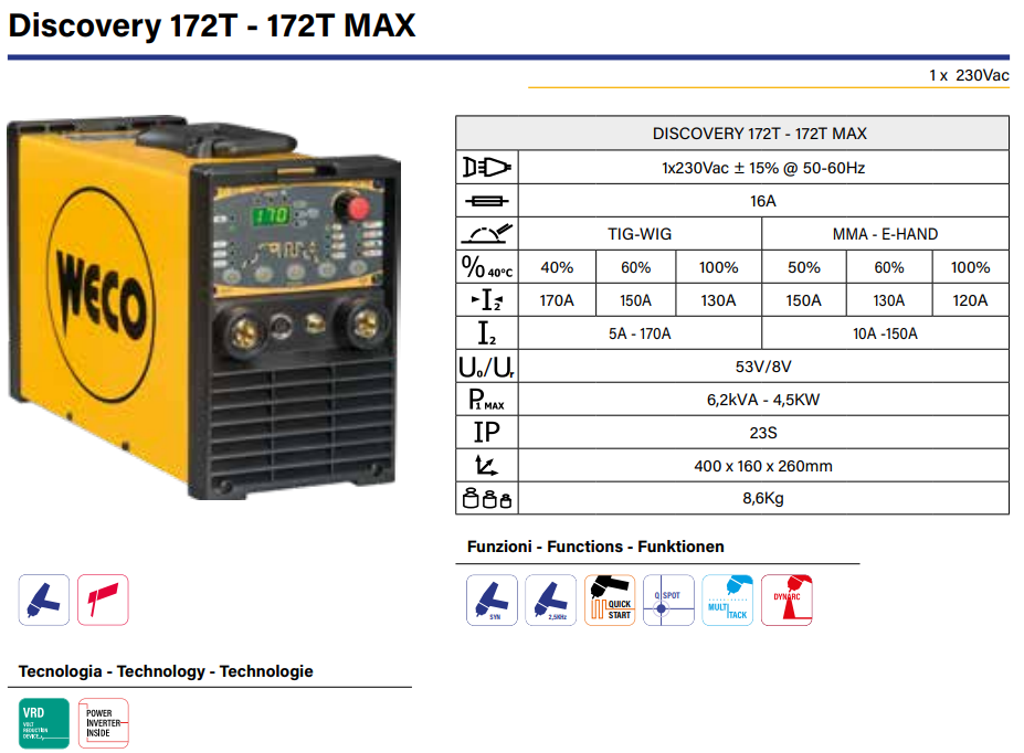 Aparatul de sudura Weco Discovery 172T este proiectat special pentru construcții de înaltă definiție, fabrici de petrol/chimice, industria alimentară și a băuturilor și șantiere navale. Controlul Weco Special HF asigură aprinderea arcului 100% rapidă și precisă.