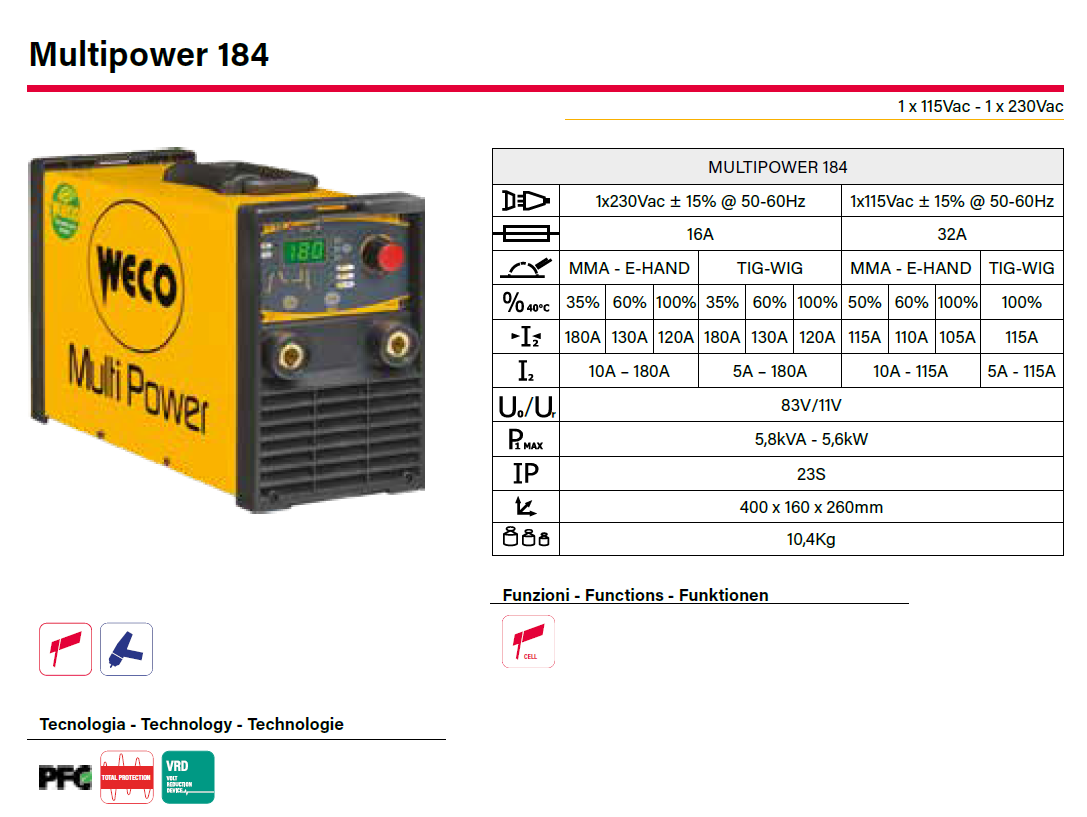 Multipower 184 este conceput special pentru întreținerea de bază, construcția clădirilor și construcția conductelor, Aparatul este echipat cu: Total Protection, PFC (Power Factor Corrector) și VRD.